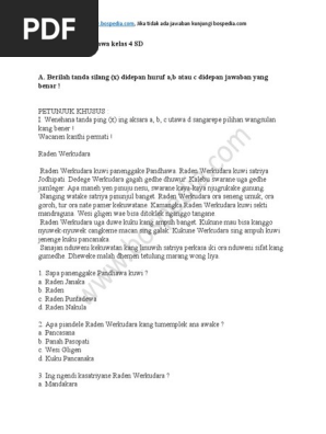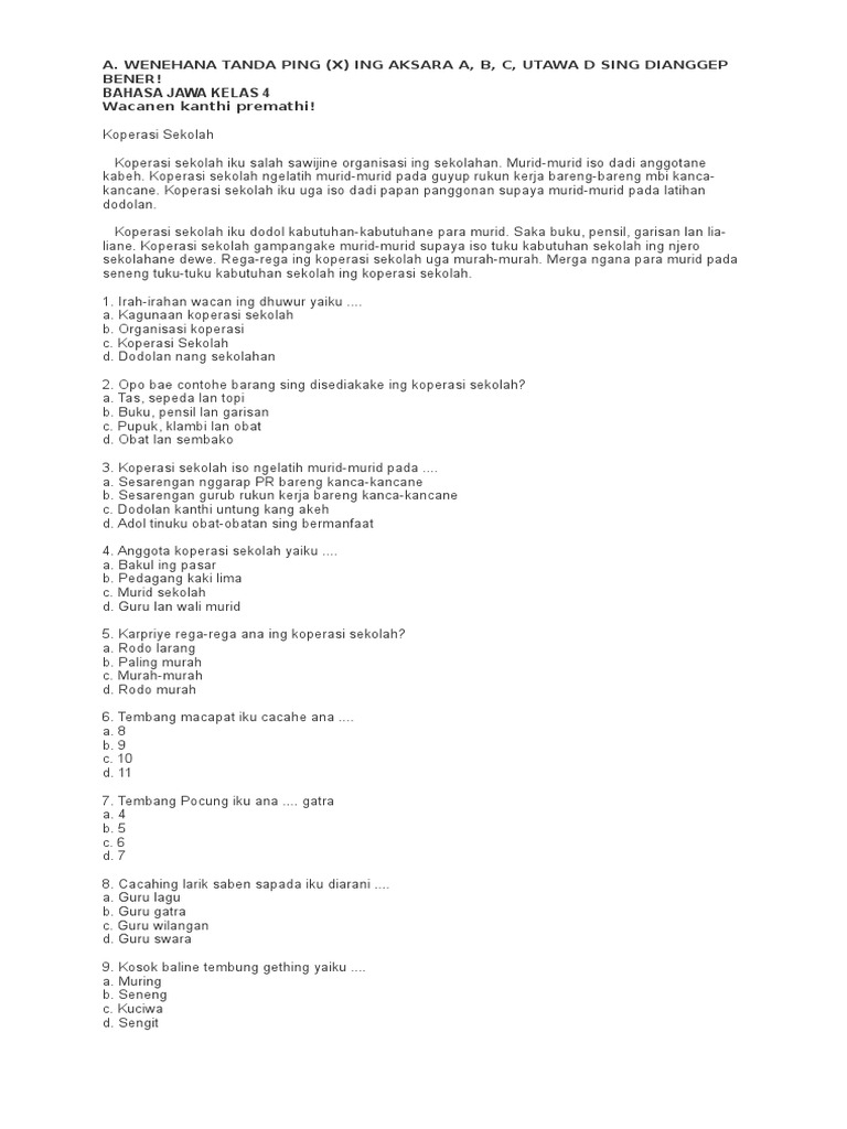 Soal Bahasa Jawa Kakak Pdf from imgv2-2-f.scribdassets.com Întreabă ce nu ştii să faci din temă. Manuk thilang ngoceh ana pang gedhang cedhak kandhang. Dapatkan penjelasan bukan hanya jawaban. Nastiti lan ajeng dadi sahabat pena. Sakubengé kelir diwènèhi bolongan kanggo ngubetké tali nalika masang kelir ning warangkané. Nastiti nulis layang kanggo ajeng, jejere. Nalika aku isih cilik, aku seneng banget maca. Kekancan kang diwiwiti kanthi nyilih pena d.